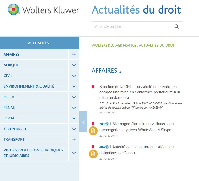 Grâce notamment aux dépêches de l'AFP, le site de veille juridique de Wolters Kluwer, https://www.actualitesdudroit.fr/ , s'enrichit de nouveaux contenus.